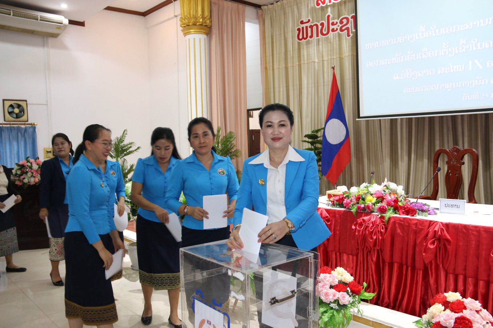 ໃນຕອນທ້າຍ ຜູ້ແທນກອງປະຊຸມກໍໄດ້ໃຊ້ສິດຂອງຕົນ ປ່ອນບັດທາບທາມບຸກຄະລາກອນຮອບທີ 1 ເພື່ອຮັບສະໝັກເຂົ້າຄະນະບໍລິຫານງານສູນກາງສະຫະພັນແມ່ຍິງລາວ ສະໄໝທີ IX.